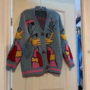 Cozy knit cardigan featuring a playful cartoon character design. Vibrant pink and yellow accents on a blue background. Perfect for adding a fun touch to your outfit. New size Xs