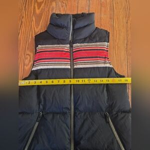 Pendelton black puffer vest with bold red stripes. Features a mock collar and zippered pockets. Perfect for layering.