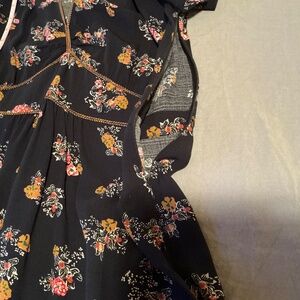 Sessun Jimama dress in printed viscose crepe. Short Sleeve Knee-Length Floral. Black background with yellow and red floral. Super flattering. Perfect for weddings, showers, brunches… Can be easily dressed up with heels or worn more casually with sneakers or a low sandal. Purchased at The Bay…