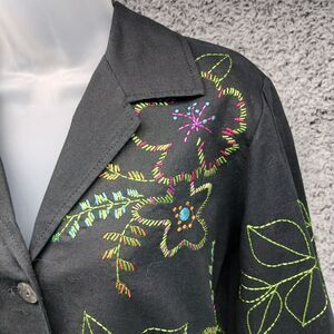 Mark Singer Software Women's Small Linen/ Cotton Lined Shacket/ Jacket. Embroidered Neon Flowers/ Black. Collard. Four Button Closure.