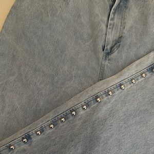 Stylish light blue flare jeans with elegant stud accents. Perfect for a chic, casual look.