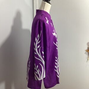 BOB MACKIE WEARABLE ART SIZE L 100% SILK PURPLE BLOUSE BUTTERFLY BIRDS