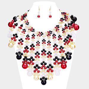 Make a bold statement with this eye-catching pearl bib necklace, inspired by classic Disney style. Featuring cascading clusters of glossy pearls in red, black, white, and gold, this necklace creates a dramatic, luxe look that instantly elevates any outfit.