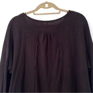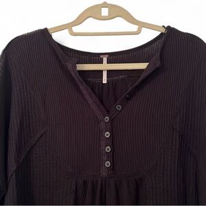 Free People Leo Henley Tee in Black. Size XS. Slouchy, laid-back thermal with classic henley button placket and signature Free People edge. Designed with a relaxed fit, rounded hem, raw unfinished trim, and dolman long sleeves for that effortless, lived-in look. Soft waffle-knit feel that’s perfect for layering or wearing on its own. Excellent pre-loved condition.