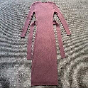 This is a cute, elegant ribbed sweater dress features a flattering fit, round neck, long sleeves, slit sides, tie waist, midi length.