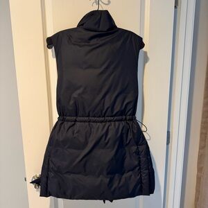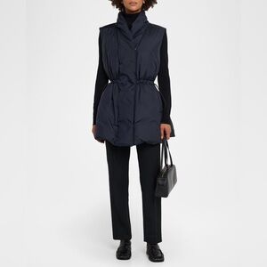 New with tags! Lafayette 148 Black Recycled Tech Down Puffer Vest, size small. Light layering meets versatility in this puffer vest, crafted from recycled technical shell filled with insulating plush down. A gathered drawcord cinches the A-line shape, while a shawl collar and placket conceals both a two-way zipper and snap fastening.