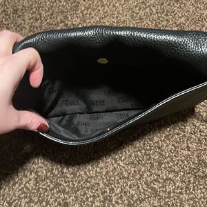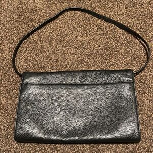 This black leather clutch has a thin, short, leather strap and gold hardware. Closure is magnetic. Interior has a small pocket, 4 card pockets, and a large zippered pocket. Exterior has a single large pocket with magnetic closure. This is the perfect bag for a night out or a day of shopping. it is like new. it was worn just a couple of times. The scuffs marks are on the metal corners.