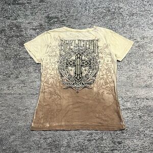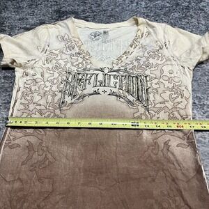 Affliction Short Live Fast Shirt Short Sleeve V Neck Rhinestone Double Sided Cyber Y2K Cute Grunge Cream Brown Size Medium