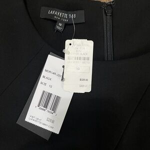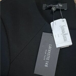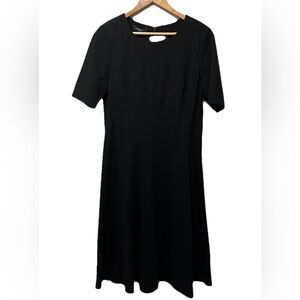 NWT Lafayette 148 New York midi dress in sleek black ponte knit. Stretchy, seamed detailing, short sleeves, and a flattering A-line silhouette. Perfect for work, events, or evenings out. Retail $498.