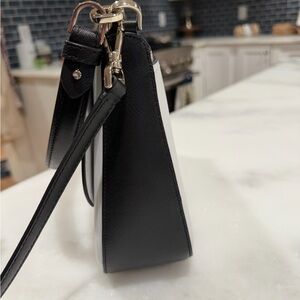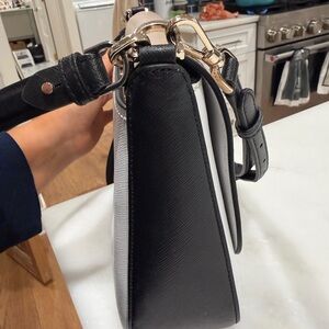Kate Spade New York flap crossbody bag in a beautiful beige blush pink and white colorblock design with black trim and silver-tone hardware. Features a structured silhouette with flap snap closure and adjustable strap for crossbody or shoulder wear.