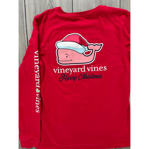 This is a pre-owned Vineyard Vines long-sleeve t-shirt in red, size Large (14). The shirt features a graphic of a whale wearing a Santa hat on the left chest pocket and a larger version on the back, accompanied by "vineyard vines Merry Christmas." The left sleeve also displays "vineyard vines" vertically with a small Christmas tree graphic.