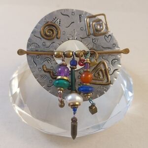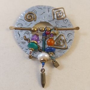 Circular brooch with artistic engravings and colorful bead accents. Features purple, green, orange, and white beads.