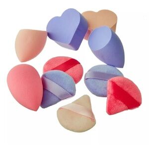 Set of 10 heart-shaped makeup sponges in pastel colors. Perfect for blending and applying makeup.