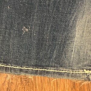 Dark blue jeans with distinctive white accents. Features branded button and label. Ideal for everyday style.