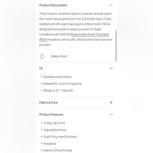 Size Small. Color: Black. This full-length layer is fully waterproof with seam taping and a fitted hood. Designed to keep you warm in frigid conditions with 650 grams of responsibly sourced down, wind cuffs and brushed hand-warmer pockets
