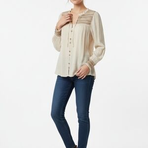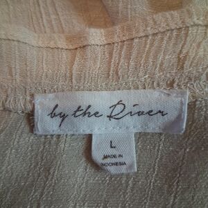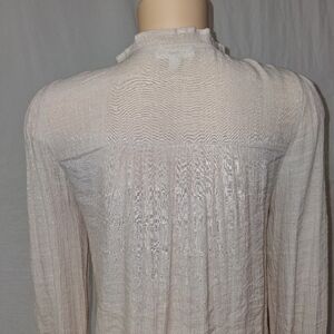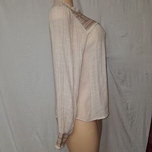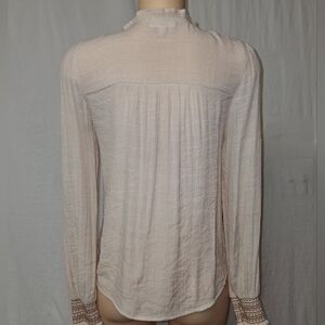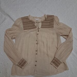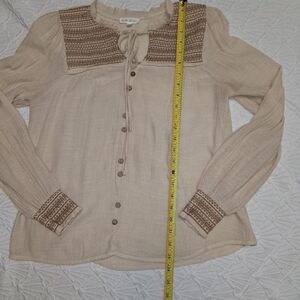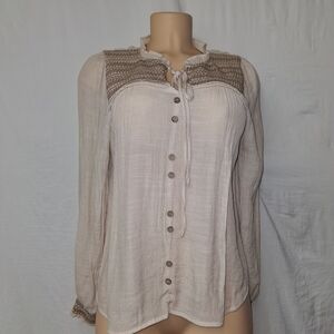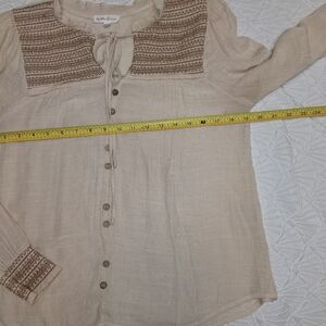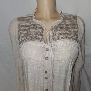 This elegant cream button-up top features a delicate design perfect for any occasion. This is a beige sheer gauze long-sleeve women's blouse with a ruffled collar and embroidered yoke. The lightweight fabric and stylish details make it a must-have in your wardrobe. size L 63 %rayon 37 % polyester