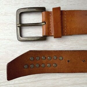 Vintage Studded Tan Leather Belt (36) Brass Hex Grunge Boho Western Festival