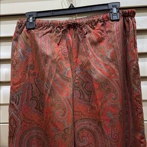 Elegant red paisley pajama set. Button-up top with long sleeves. Comfortable matching pants.