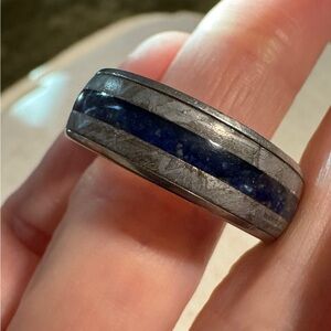 This bold wedding band is crafted from quality meteorite, titanium and has a natural blue lapis accent.