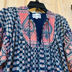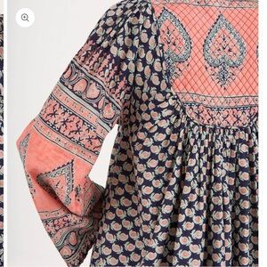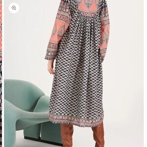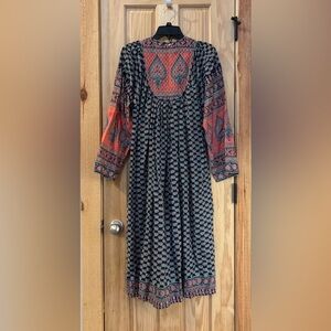 Chic long sleeve dress with intricate patterns. Features a blend of coral, navy, and teal. Perfect for stylish outings.