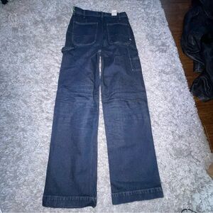 The AMERICAN EAGLE AE77 Premium Stovepipe Carpenter Jeans in Dark Wash are a stylish and versatile choice for women. Featuring a high waist and wide-leg style, these jeans are made of cotton denim with a solid blue color. The 5-pocket design and zip/button closure add practicality to the classic look, making them perfect for any season. With a waist size of 27 inches and inseam of 28 inches, these jeans are designed for a petite body type, offering both comfort and fashion in one.