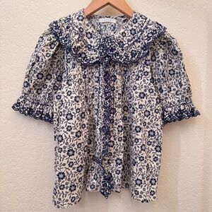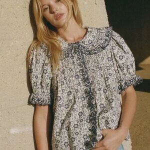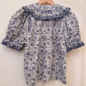 Featuring a stunning scalloped embroidered collar, ruffle trim down the front, and soft puff sleeves with ruffle cuffs. Lightweight, flattering, and easy to dress up or down.