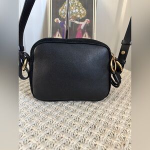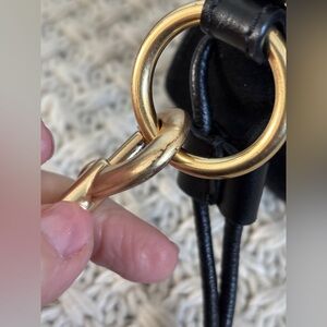 See by Chloe Tony small crossbody bag in black. Suede and smooth leather with gold tone hardware. Zipped closure, exterior snap pocket, and an interior slip pocket. There is also a small strap on the side with a hook that connects to the ring on the front. I’m not sure what Chloe’s intent was but you can also remove the long strap and attach the hook to the ring on the other side to make a small strap. You can also attach it to the ring on the same side to make a wrist strap.