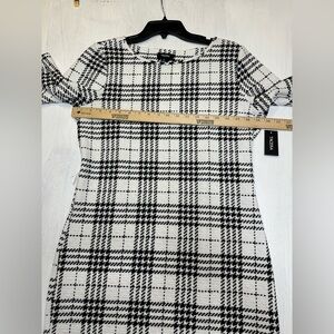 plaid midi dress, checkered dress, black white dress, stretch knit dress, 3/4 sleeve dress, office dress, church dress, modest dress, winter fall dress, textured knit, pattern dress, workwear dress, TACERA dress large, NWT dress