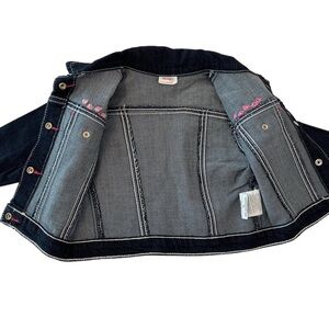 ADORABLE baby girl AUTHENTIC denim jacket by Wrangler. Features dark blue fabric with pink and white stitching and pink heart embroidery.
