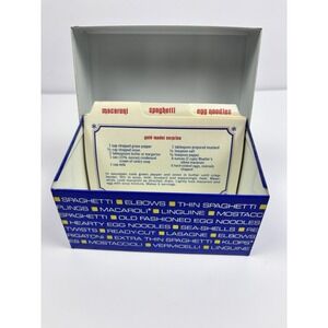 The Vintage MUELLER'S PASTA Tin Metal Recipe Box from 1980 is a charming collectible item with a retro design. This medium-sized rectangle box includes 1 compartment and comes with original recipe cards, adding to its nostalgic appeal. The multicolor metal box features an attached lid and is a perfect addition to any kitchen storage and organization collection. With its vintage charm and Mueller's brand franchise, this original piece is a unique find for adults who appreciate classic kitchen decor.