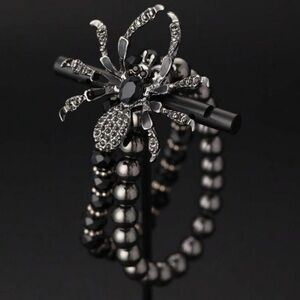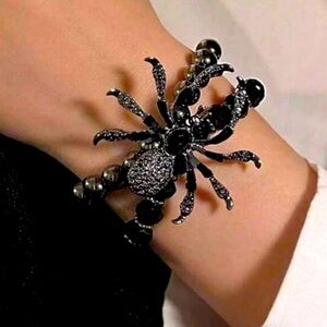Make a bold statement with this striking black and silver spider bracelet. Perfect for adding an edgy touch to any outfit.