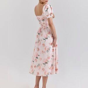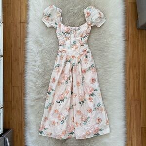 House of CB Lulabell Peach Floral Cotton Puff Sleeve Midi Dress Corset Back A-C