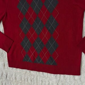 Stylish V-neck sweater with a classic argyle design. Features rich red and gray colors. Perfect for any occasion.