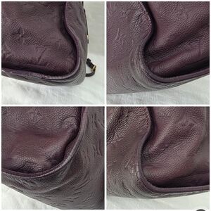 This spacious tote bag is constructed of Louis Vuitton monogram embossed leather in deep purple with sides that widen toward the top. The shoulder bag features leather strap handles, an optional shoulder strap with brass handle links, a facing zipper pocket, and a top padlock zipper that opens to a clean matching striped fabric interior with zipper and patch pockets.