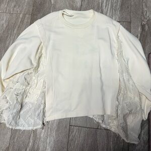 This is thick and very well made. Ivory more than bright white. Size large. The sides of the top of lace and textured. They did have a string to cinch the sides shut but I did remove them to keep the top open and I no longer have them. That’s the only “flaw” the sweater has. It’s in good condition and very soft. Cannot tell any strong was supposed to be there.