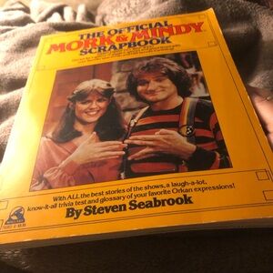 The Official Mork & Mindy Scrapbook by Steven Seabrook. Features stories, trivia, and a glossary of Orkan expressions. Bright yellow cover with iconic characters. If you grew up watching Mork & Mindy when you were a kid, this book is pure nostalgia! It is in excellent condition except for some pencil writing in it and a corner of the cover is bent.