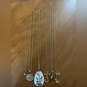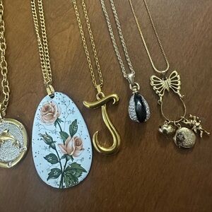 Elegant gold and silver necklace set featuring floral and letter designs. Perfect for adding a touch of sophistication to any outfit.