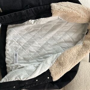 Stylish black denim jacket with cozy cream sherpa collar. Warm inner lining and medium to heavy weigh to it perfect for colder weather.