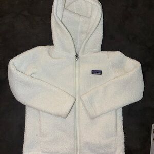 Cozy Patagonia kids sherpa fleece hoodie in a classic cream/ivory color. Soft, warm, and perfect for layering on chilly days. Features a full zip front, attached hood, and roomy front pockets.
