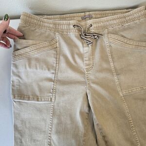 Maurices Weekender Drawstring pants, tan/beige, size XL. Super comfortable, casual pull-on style pants, elastic waist with functional drawstring. Pockets front and back. Seam detail on the leg for a nice elevated touch. Cotton blend with 2% spandex.