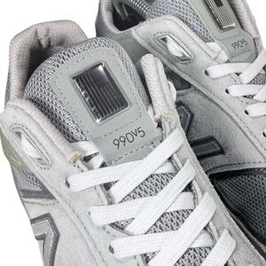 This is a pair of New Balance 990v5 in Grey and White men's athletic shoe in size 11. This shoe features a lace-up closure, rubber outsole, and cushioned insole for comfort and support. With a solid gray-tone colors and a low-top shoe shaft style, it is suitable for various occasions including activewear, casual wear, and workwear. This shoe is part of the New Balance 990 product line and is made in the United States.