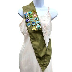 Vintage Scout sash in classic olive green with 14 sewn-on embroidered merit badges—a great collectible piece with bright colors and iconic scouting imagery.