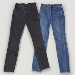 Chic skinny jeans by Madewell. Features classic black and vibrant blue options. Perfect for versatile styling.