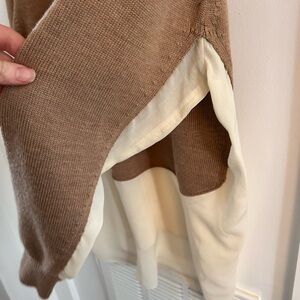 Long sleeve paneled knit wool and viscose georgette cardigan colorblocked in brown and off-white. Rib knit V-neck collar and cuffs. Button closure at front. Shirttail hem. Vented side-seams. Off-white hardware. Contrast stitching in white