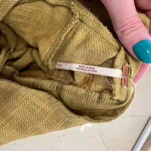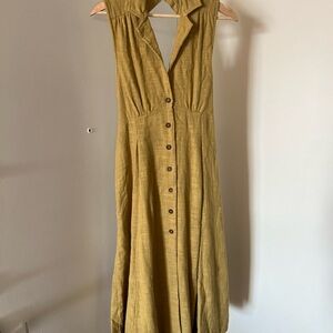 Mustard colour midi linen dress with button-down front. Runs a bit big, would fit medium.