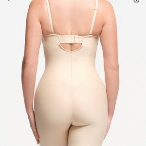Your waist will look incredible. This mid-thigh bodysuit is designed in our signature SKIMS Body fabric with targeted core compression that reduces your waistline up to two inches. Molded, lightly lined cups and an underwire offer unmatched lift and support. Features removable, adjustable straps and a hook and eye closure. Complete with raw cut leg openings and an open gusset for a comfortable feel.