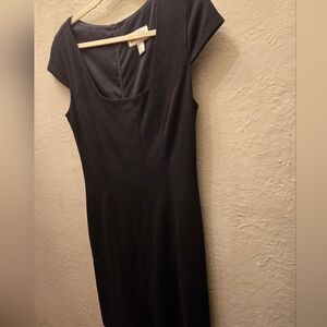 Elegant and timeless Joseph Ribkoff black sheath dress, made in Canada. This classic piece features a flattering tailored silhouette with subtle princess seams, cap sleeves, and a structured square-scoop neckline.