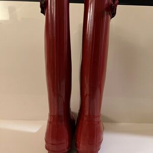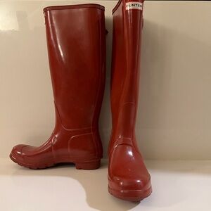 Bold red Hunter boots. Perfect for wet weather. Durable and stylish.