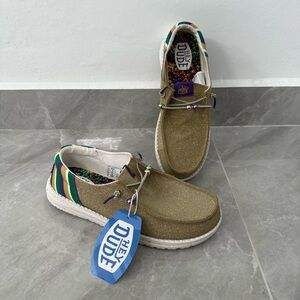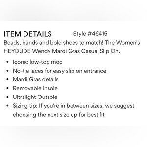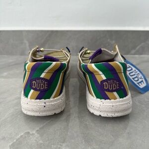 Brand new with tags and without box - Women's Hey Dude Wendy Mardi Gras Casual Slip On Shoes Sparkle Party. Colors: gold, white, purple, and green. Size: 10.