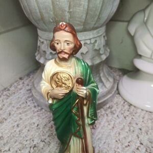 Very nice with slight signs of wear, vintage hand painted St. Jude Statue, holding a gold medallion with Jesus's profile, stamped Italy on back. Colors are a gorgeous shade of teal green, ivory, and gold. Statue has remnant of fabric on base bottom, height is 8 3/4 inches. Please see all photos.
